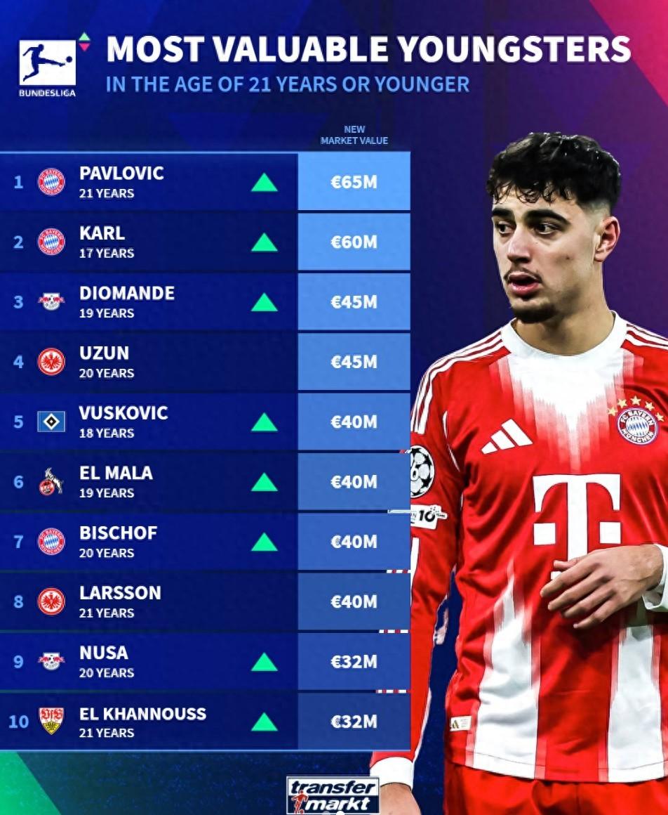 北京時間12月19日,在更新了德甲球員的身價之後,德轉列出了此次更新後德甲身價最高的10名U21球員,亞歷山大-帕夫洛維奇6500萬歐元第一,倫納特-卡爾6000萬歐元第二,比朔夫4000萬歐元上榜。