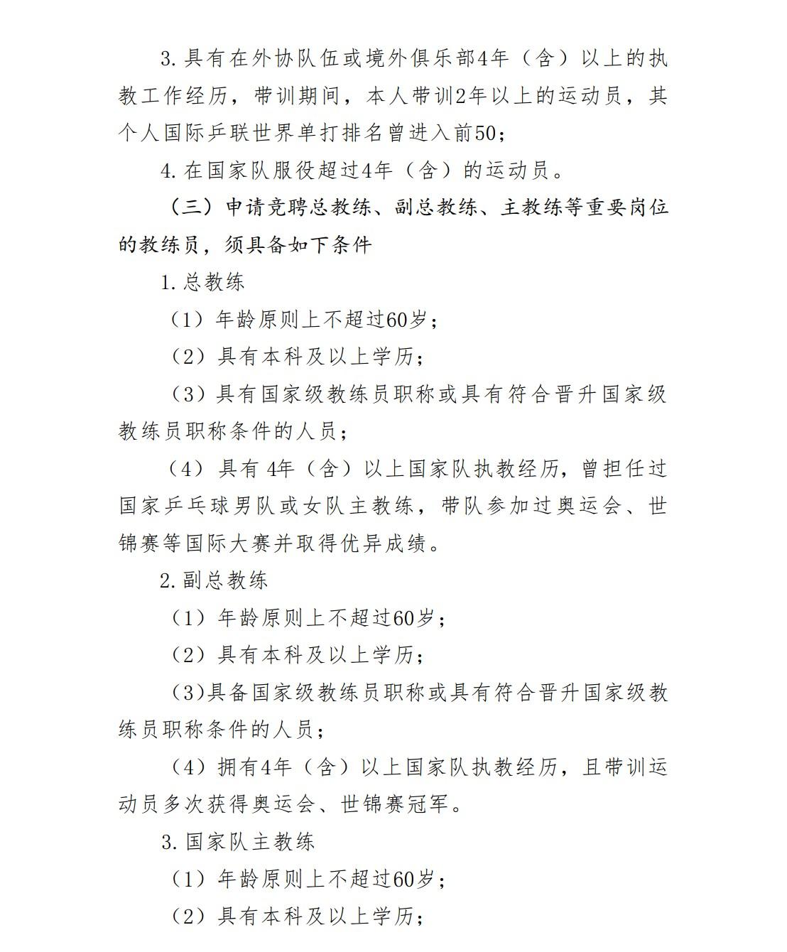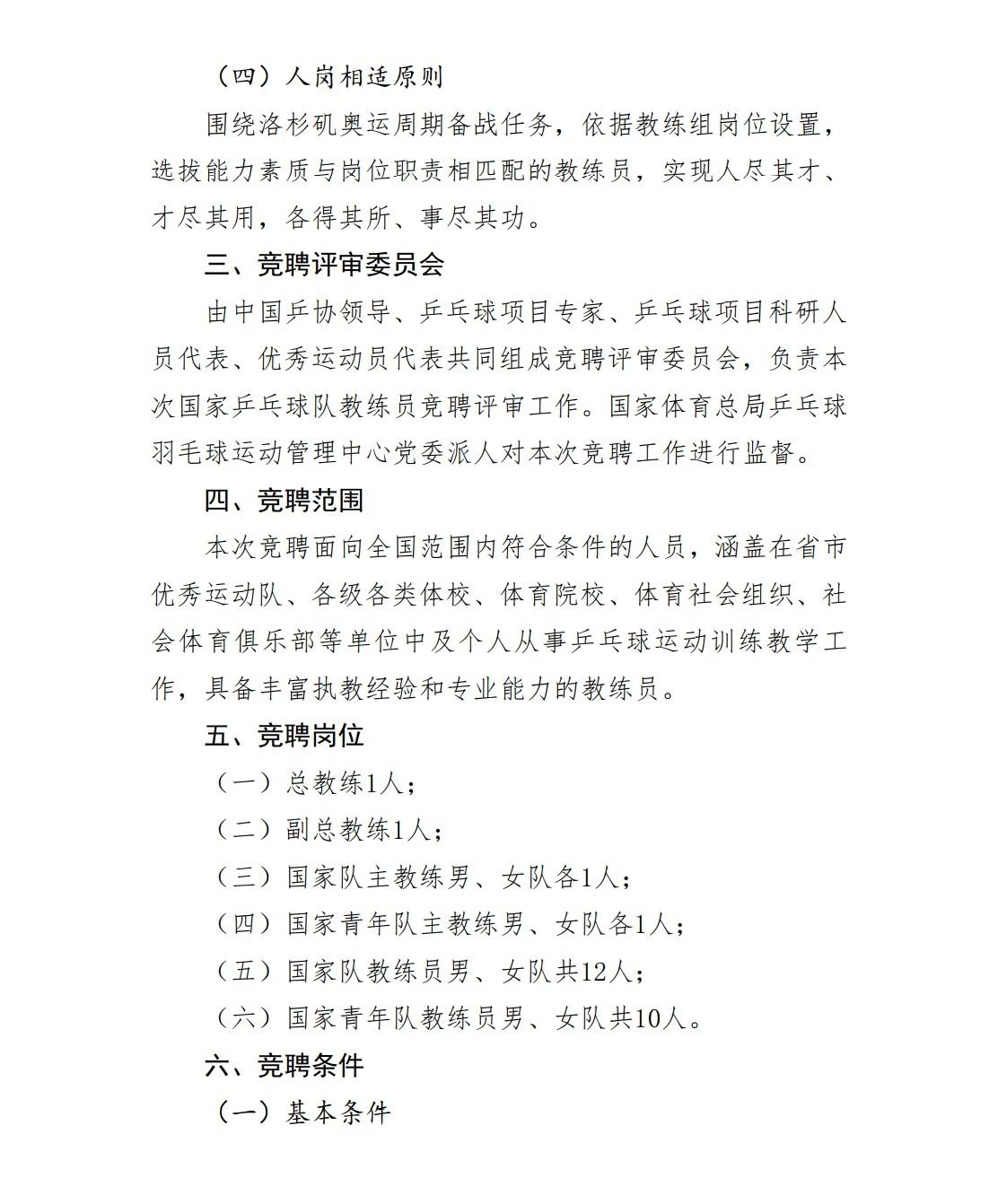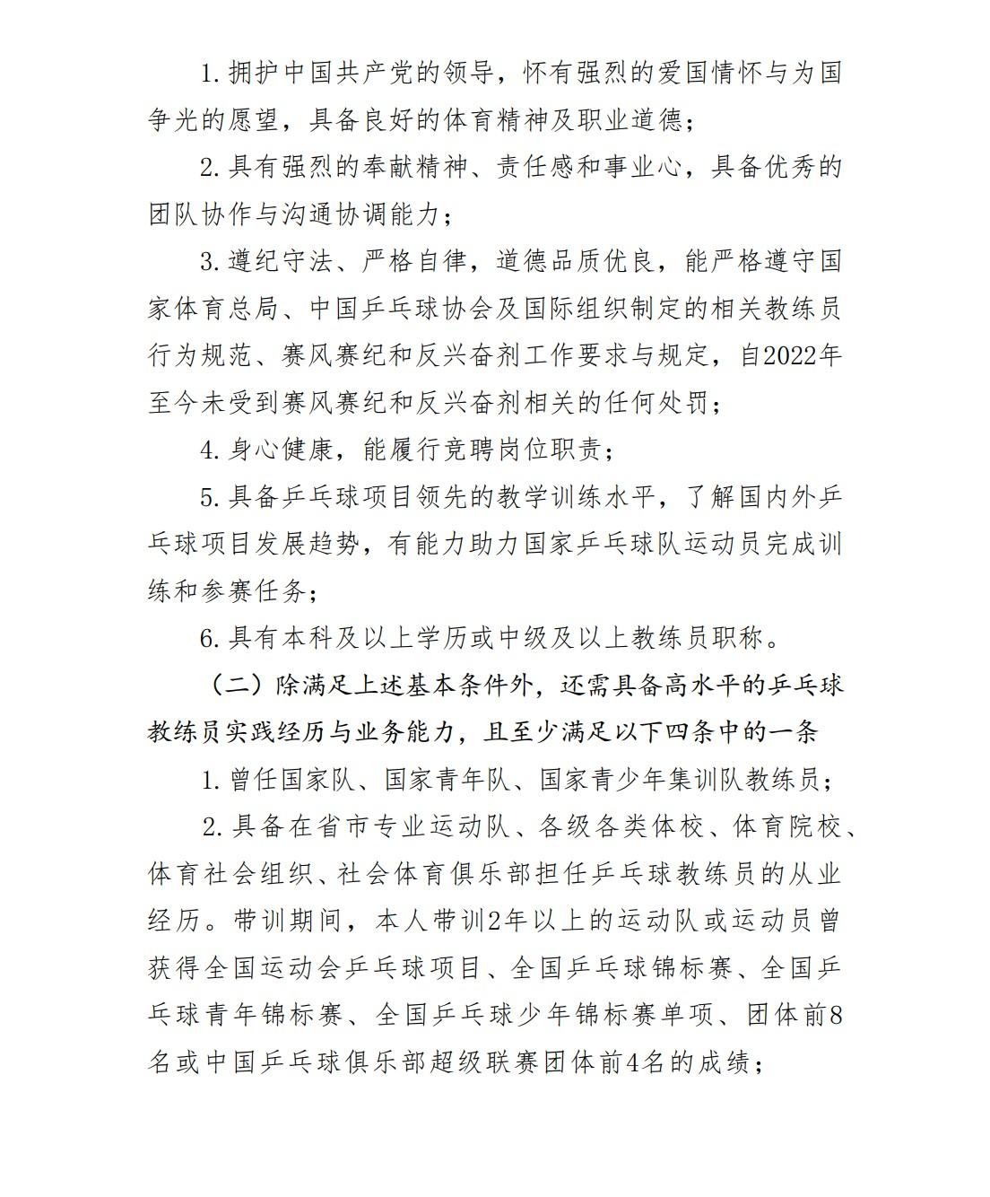 爲進一步加強國家乒乓球隊教練員隊伍建設,更好地完成2028年洛杉磯奧運週期各項備戰參賽任務,中國乒協擬通過公開競聘方式,組建新一屆國家乒乓球隊教練組,現就有關事項通知如下: