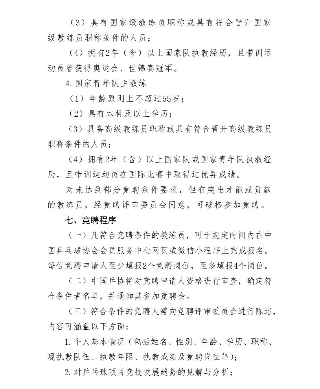 (一)擬參與競聘人員需詳細閱讀附件:《洛杉磯奧運週期國家乒乓球隊教練員競聘工作方案》,按照要求進行競聘報名並提交相關證明材料;