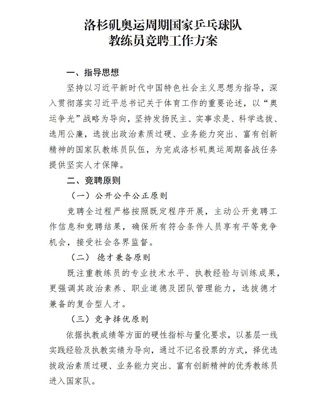 (一)擬參與競聘人員需詳細閱讀附件:《洛杉磯奧運週期國家乒乓球隊教練員競聘工作方案》,按照要求進行競聘報名並提交相關證明材料;