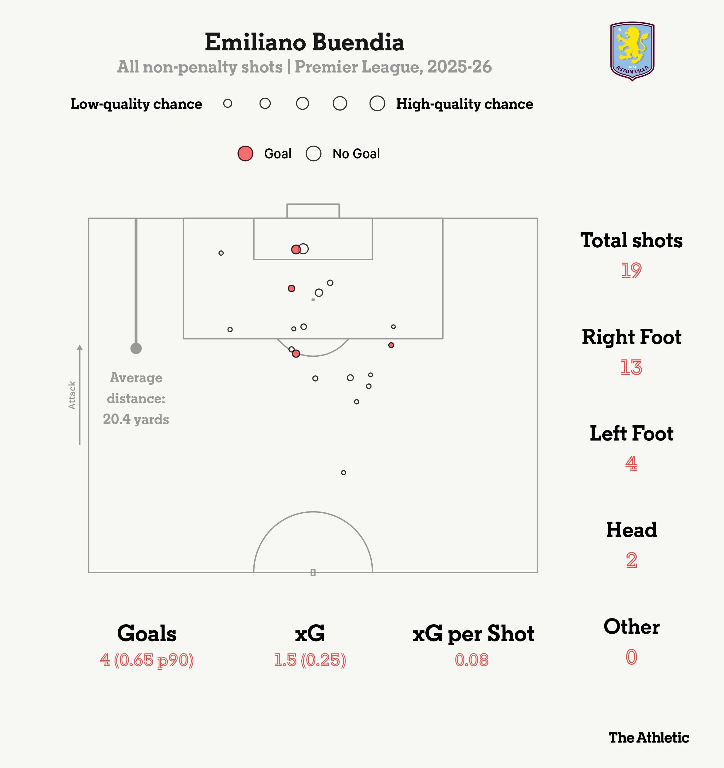 在因前十字韌帶傷病導致2023-24賽季報銷,以及一月份租借至德國勒沃庫森僅獲得三次首發後,布恩迪亞在2025-26賽季強勢迴歸,在14場聯賽出場中貢獻4球2助攻。這位28歲的阿根廷人本賽季的“進球+助攻”每90分鐘效率,是其職業生涯中所有賽季裏最高的。
