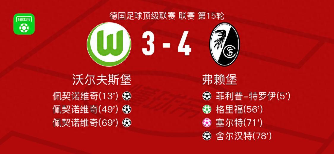 北京時間12月20日德國足球頂級聯賽 聯賽 第15輪,沃爾夫斯堡主場對陣弗賴堡。沃爾夫斯堡佩契諾維奇帽子戲法,塞爾特自擺烏龍。弗賴堡菲利普-特羅伊破門,舍爾漢特破門,格里福破門。最終比分沃爾夫斯堡 3-4 弗賴堡。