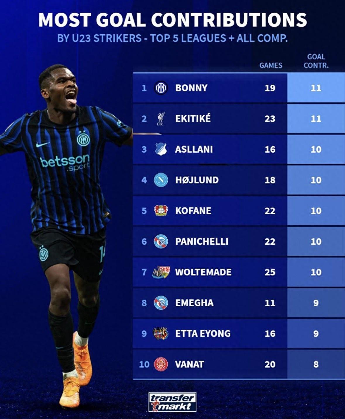 北京時間12月20日,德轉列出了本賽季至今歐洲五大聯賽U23前鋒各項賽事直接參與進球數前10,國際米蘭的博尼和利物浦的埃基蒂克同以11球並列第一,霍伊倫、沃爾特馬德上榜。