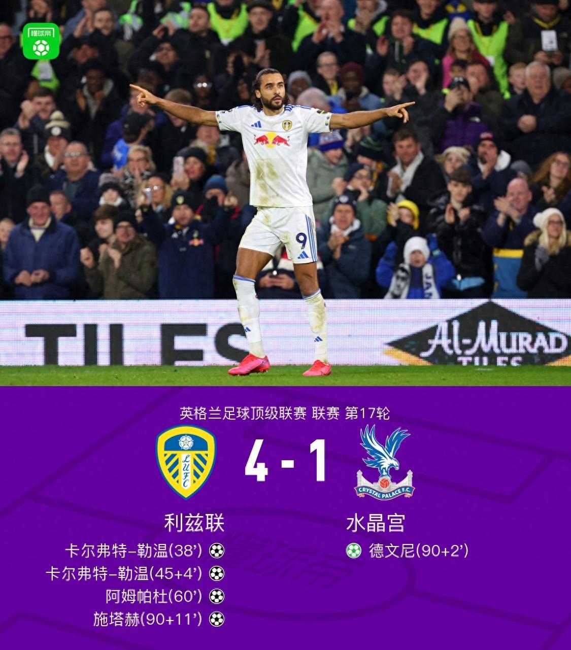 北京時間12月21日,英格蘭足球頂級聯賽第17輪,利茲聯坐鎮主場迎戰水晶宮。比賽中,卡爾弗特-勒溫率先破門,爲利茲聯取得領先。隨後比約爾送出助攻,卡爾弗特-勒溫再入一球,完成個人梅開二度。易邊再戰,阿姆帕杜接隊友配合後攻入一球,進一步擴大比分優勢。水晶宮由德文尼通過點球扳回一分。比賽最後階段,施塔赫抓住機會再下一城,鎖定勝局。最終全場比賽結束,利茲聯以4比1戰勝水晶宮。