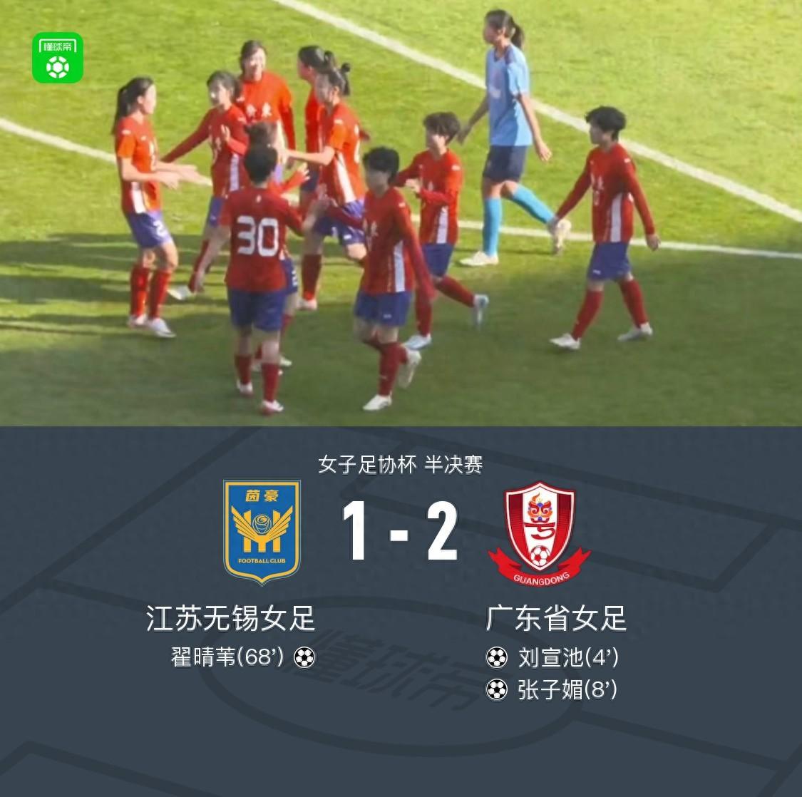 北京時間12月21日,女子足協盃半決賽展開較量,江蘇無錫女足與廣東省女足展開對決。上半場劉宣池開場頭球破門,隨後張子媚過人後在禁區內勁射破門擴大比分。下半場翟晴葦轟出一記世界波扳回一球。最終廣東女足2-1戰勝江蘇無錫女足進決賽。