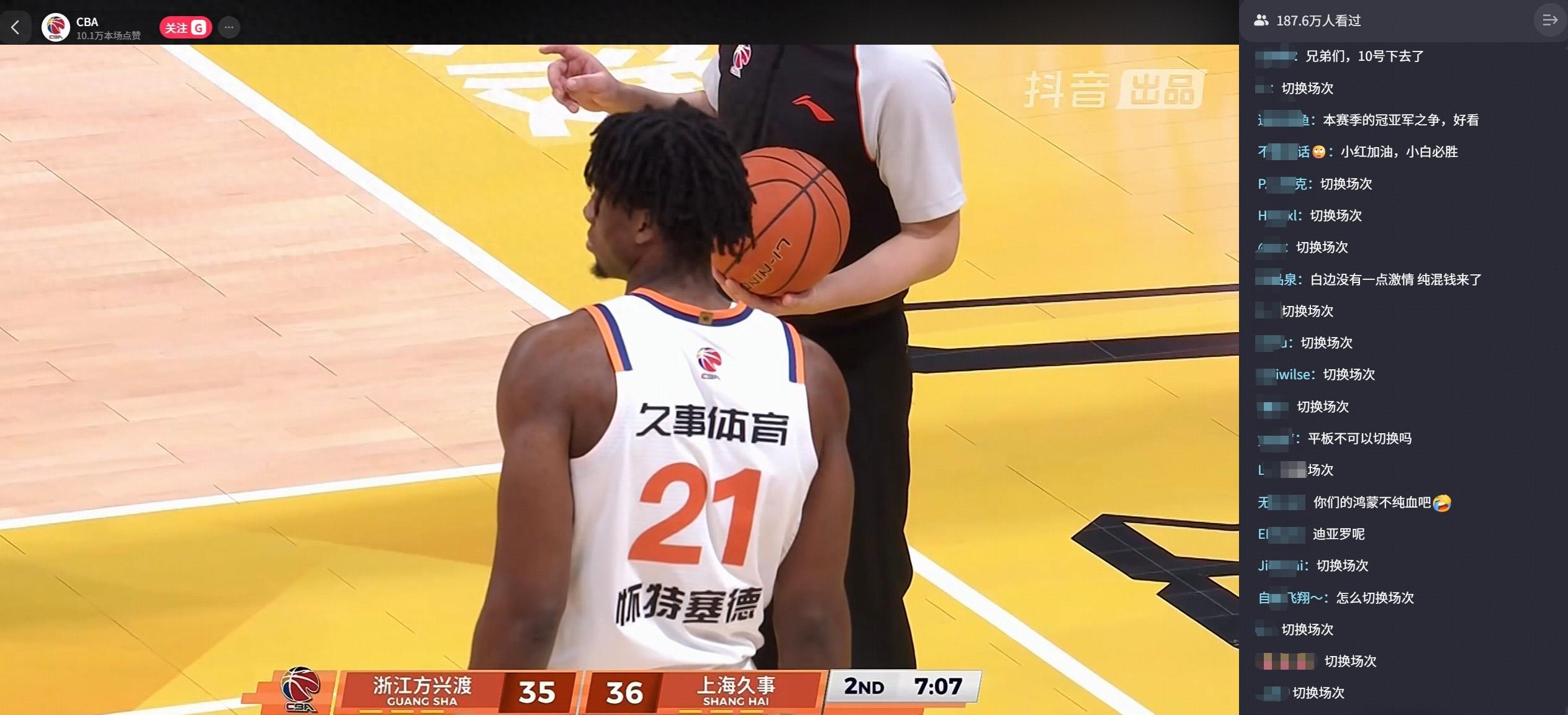 今年常規賽的轉播權由咪咕轉成了抖音,但有意思的是,在CBA的抖音直播間,充滿了“切換場次”的彈幕。
