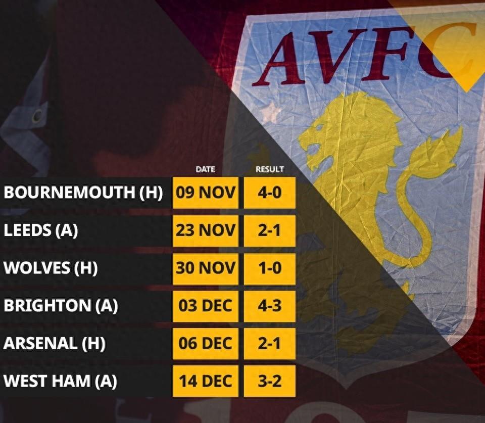 維拉最近6場英超比賽全部取得勝利,先後擊敗伯恩茅斯(4-0)、利茲聯(2-1)、狼隊(1-0)、布萊頓(4-3)、阿森納(2-1)和西漢姆聯(3-2)。