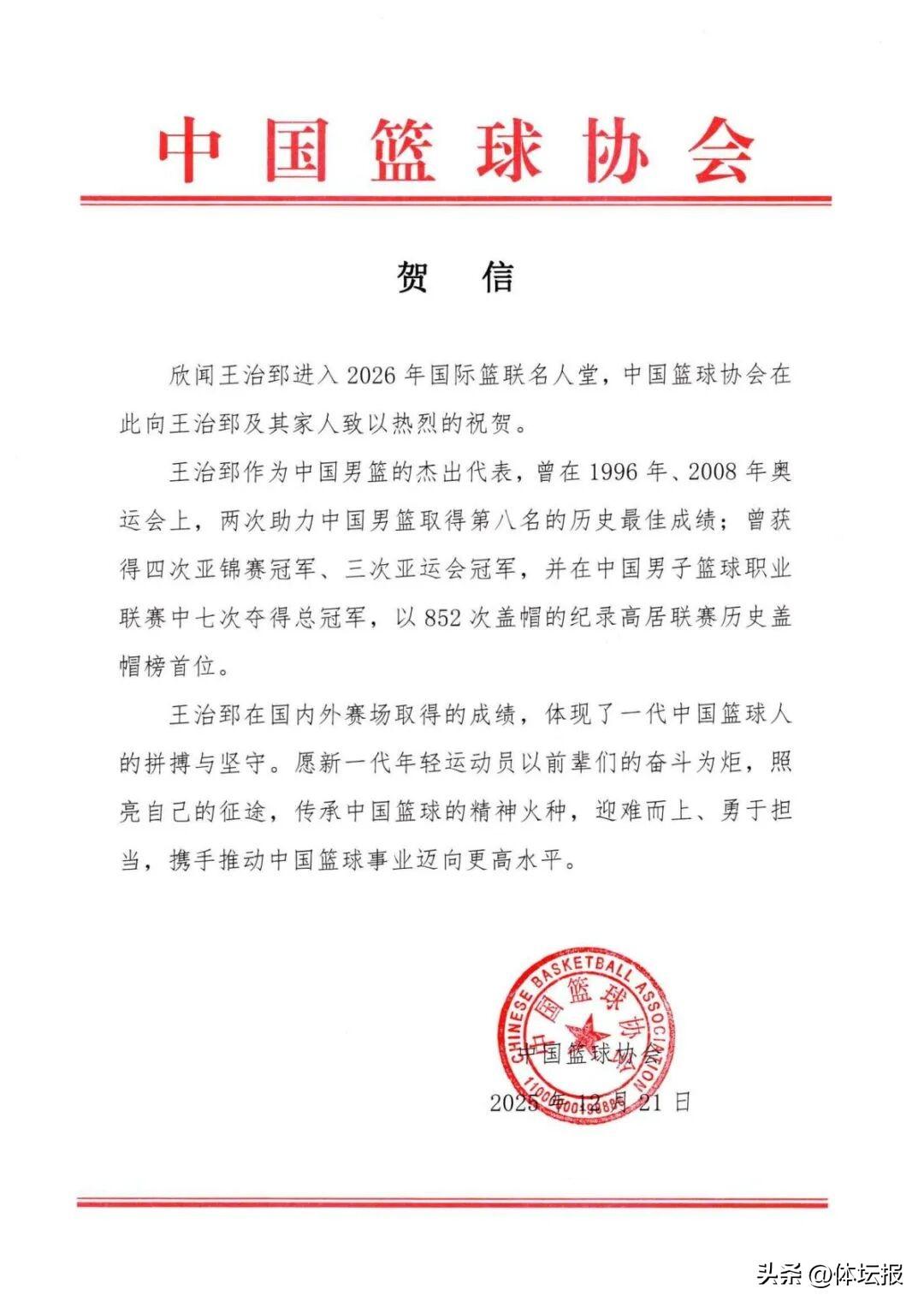 同日,中國籃球協會發賀信,祝賀王治郅入選2026年國際籃聯名人堂。