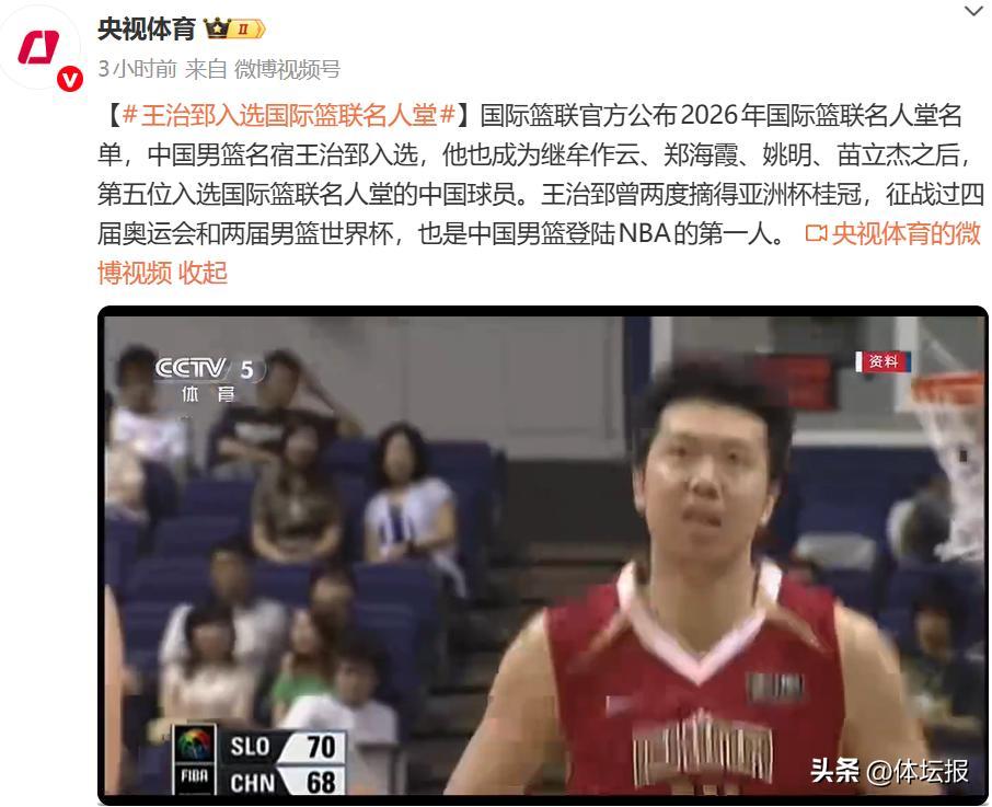 北京時間12月21日,國際籃聯官方公佈了2026年國際籃聯名人堂名單,中國男籃名宿王治郅入選,成爲繼牟作雲、鄭海霞、姚明、苗立傑之後第五位入選國際籃聯名人堂的中國球員。