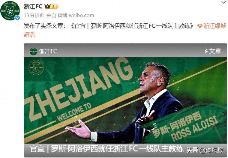 12月22日,浙江職業足球俱樂部官宣浙江隊新任主教練!浙江職業足球俱樂部近日與羅斯·阿洛伊西(Ross Aloisi)完成簽約,他將於2026賽季正式擔任浙江FC一線隊主教練。