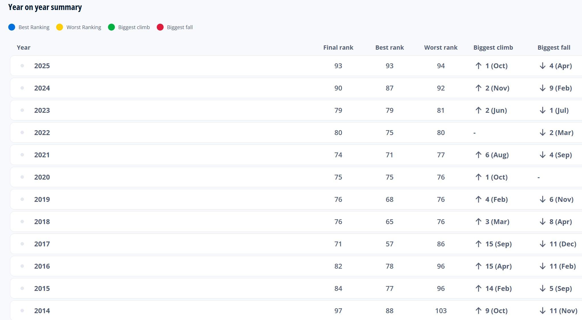 根據國際足聯發佈的排名,中國男足在2025年年終位列世界第93名,創下自2014年以來的最低年終排名紀錄。