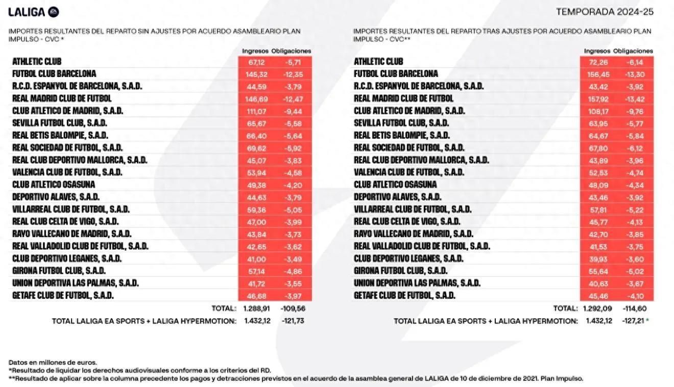 根據西甲聯盟官方公佈的最終覈算數據,2024-25賽季視聽版權總收入爲12.92億歐元。在西甲聯盟調整後,皇家馬德里以約1.5792億歐元成爲收入最高的俱樂部,巴塞羅那以約1.5645億歐元緊隨其後,馬德里競技以約1.0817億歐元排名第三。這三傢俱樂部的收入總和約佔聯賽此項總收入的35%。