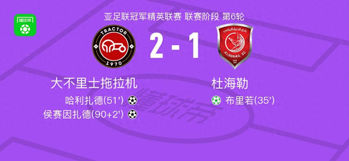 北京時間12月23日,亞足聯冠軍精英聯賽小組賽第六輪展開爭奪,大不里士拖拉機迎戰杜海勒。比賽中,杜海勒率先由布里若通過點球打破僵局。隨後,哈利扎德爲大不里士拖拉機攻入一球,將比分扳平。下半場補時階段,伊斯梅利法送出助攻,侯賽因扎德完成破門,幫助球隊實現反超。最終,大不里士拖拉機以2比1戰勝杜海勒。