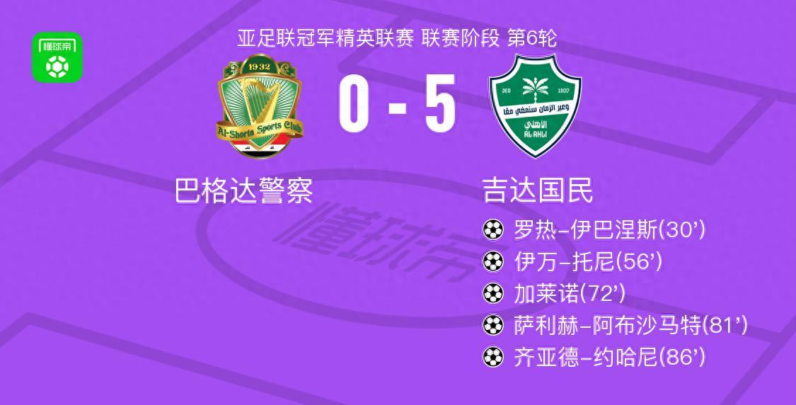 北京時間12月23日,亞足聯冠軍精英聯賽小組賽第六輪,巴格達警察迎戰吉達國民。比賽中,羅熱-伊巴涅斯接伊萬-託尼的助攻率先打破僵局。隨後,加萊諾送出精準傳球,幫助伊萬-託尼擴大比分。比賽進入下半場,薩利赫-阿布沙馬特成功策動進攻,助攻加萊諾再下一城。之後,伊萬-託尼再次貢獻關鍵傳球,助薩利赫-阿布沙馬特破門得分。臨近終場前,齊亞德-約哈尼完成進球,將比分進一步鎖定。最終全場比賽結束,巴格達警察0-5不敵吉達國民。
