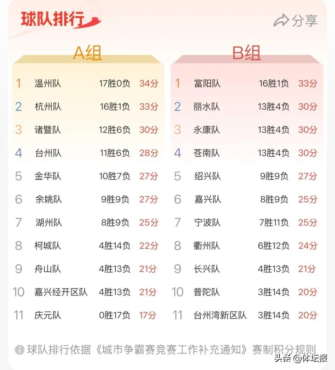 目前在B組勝負記錄相同、同積30分的麗水隊、永康隊、蒼南隊,最終排名將如何?值得期待。勝負記錄相同,如何排名?附上積分規則↓
