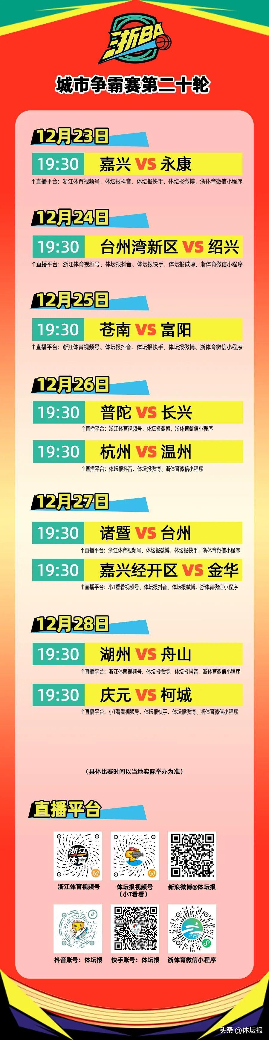 本週(12月22日-12月28日),浙BA城市爭霸賽將進行第二十輪的對決。本輪寧波、餘姚輪空,12月23日晚嘉興vs永康率先開打。