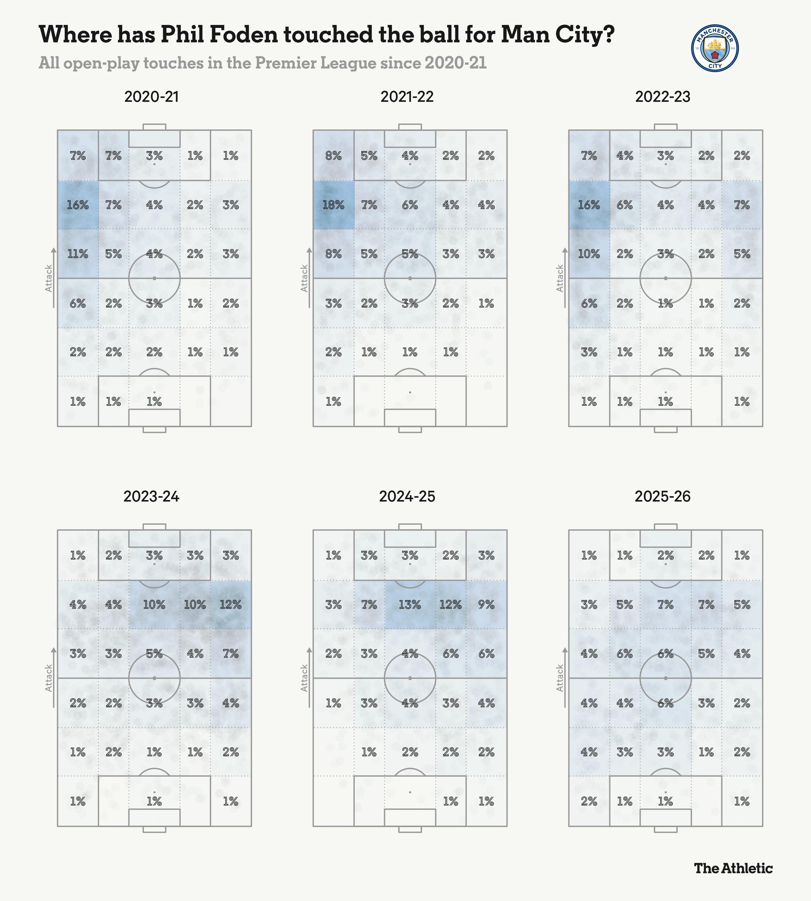 他有過幾次擔任中路的時期,但他必須等到本賽季,瓜迪奧拉才相信他已準備好完全承擔這份責任。十年循序漸進的指導,最終促成了曼城所期望的“完全體”福登的出現。