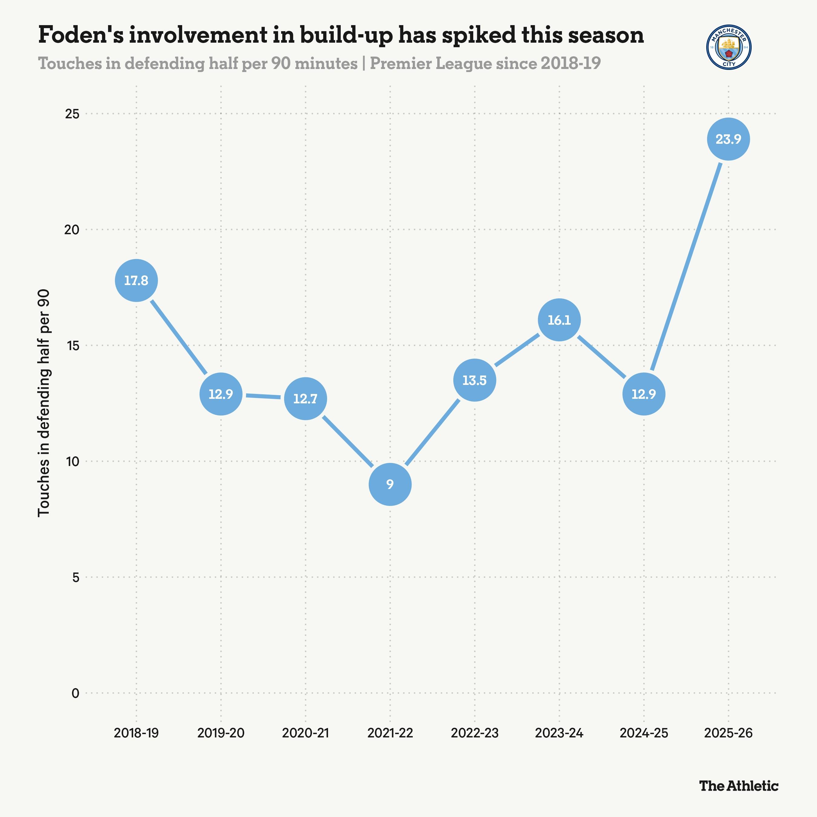 英格蘭隊主教練托馬斯-圖赫爾已確信他屬於中路,在那裏,他對比賽的影響力比以往任何時候都大。羅德里本賽季長期缺陣可能是一個因素,但如下圖所示,福登回撤接應、幫助曼城破解對手高位逼搶的次數也達到了前所未有的程度。