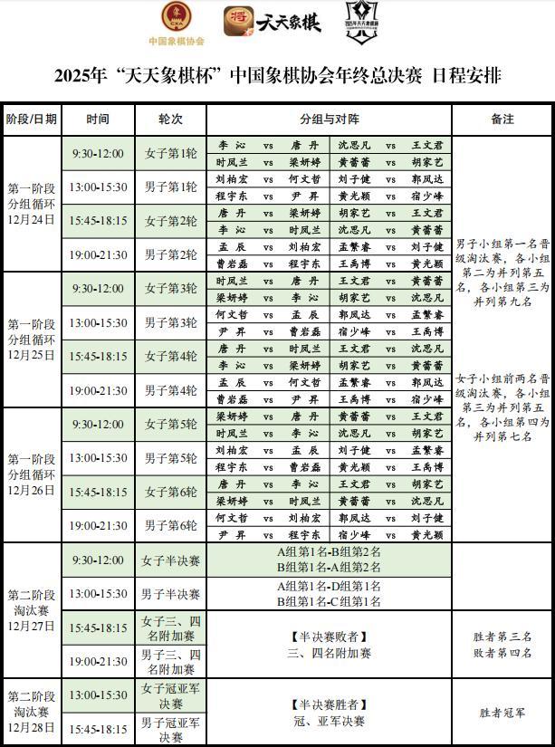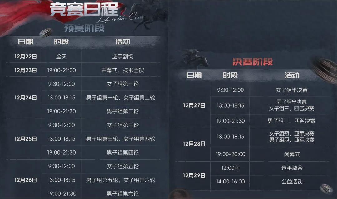 賽會12月24日至28日,每天上午九點半、下午一點、晚上七點,演繹小組賽+淘汰賽的全線超級爭鋒,角逐一百二十萬大獎,誰能一舉登頂,強取豪冠,象棋王子抖音號全程直播。
