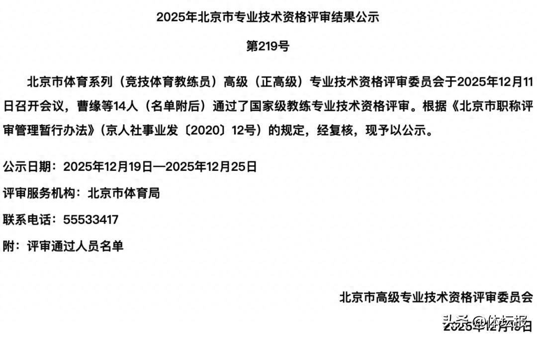 北京市體育系列(競技體育教練員)高級(正高級)專業技術資格評審委員會於2025年12月11日召開會議,曹緣等14人(名單附後)通過了國家級教練專業技術資格評審。根據《北京市職稱評審管理暫行辦法》(京人社事業發〔2020〕12號)的規定,經複覈,現予以公示。