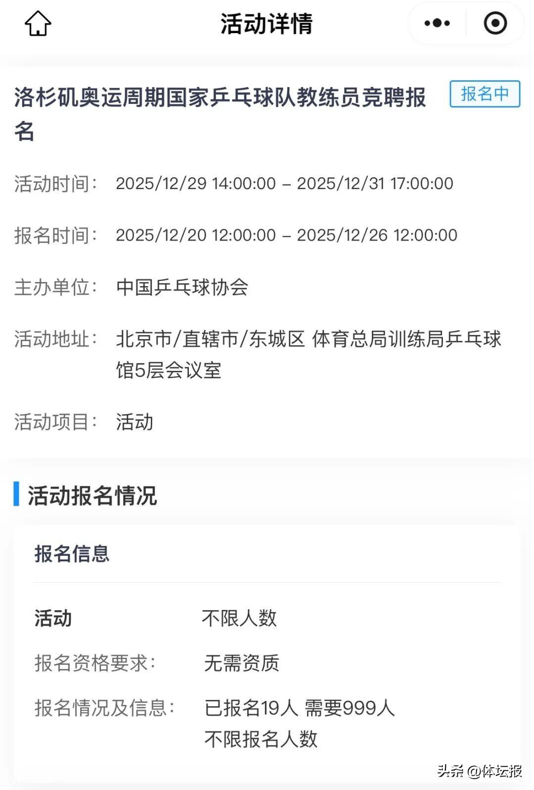 另一方面,乒乓球國家隊教練團隊的公開競聘已經於12月20日啓動,截至24日10點,報名人數已達19人。