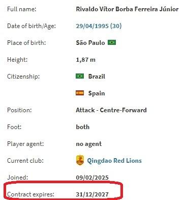 2025賽季中甲聯賽,青島紅獅最終排名墊底,降入中乙。不過,巴西攻擊手裏瓦爾迪尼奧與青島紅獅俱樂部的合同是簽到2027年12月31日。