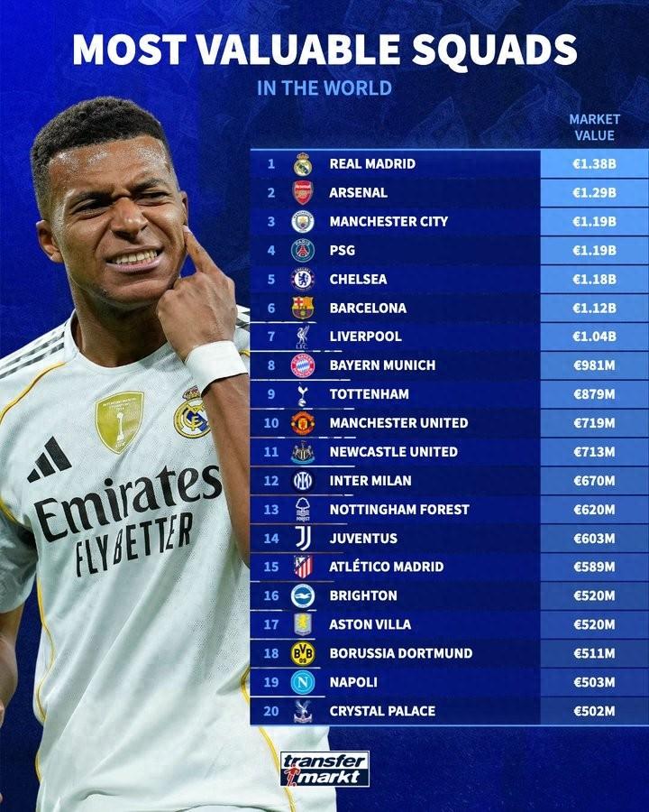 德轉列總身價最高球隊排名:皇馬13.8億歐居首,阿森納第二