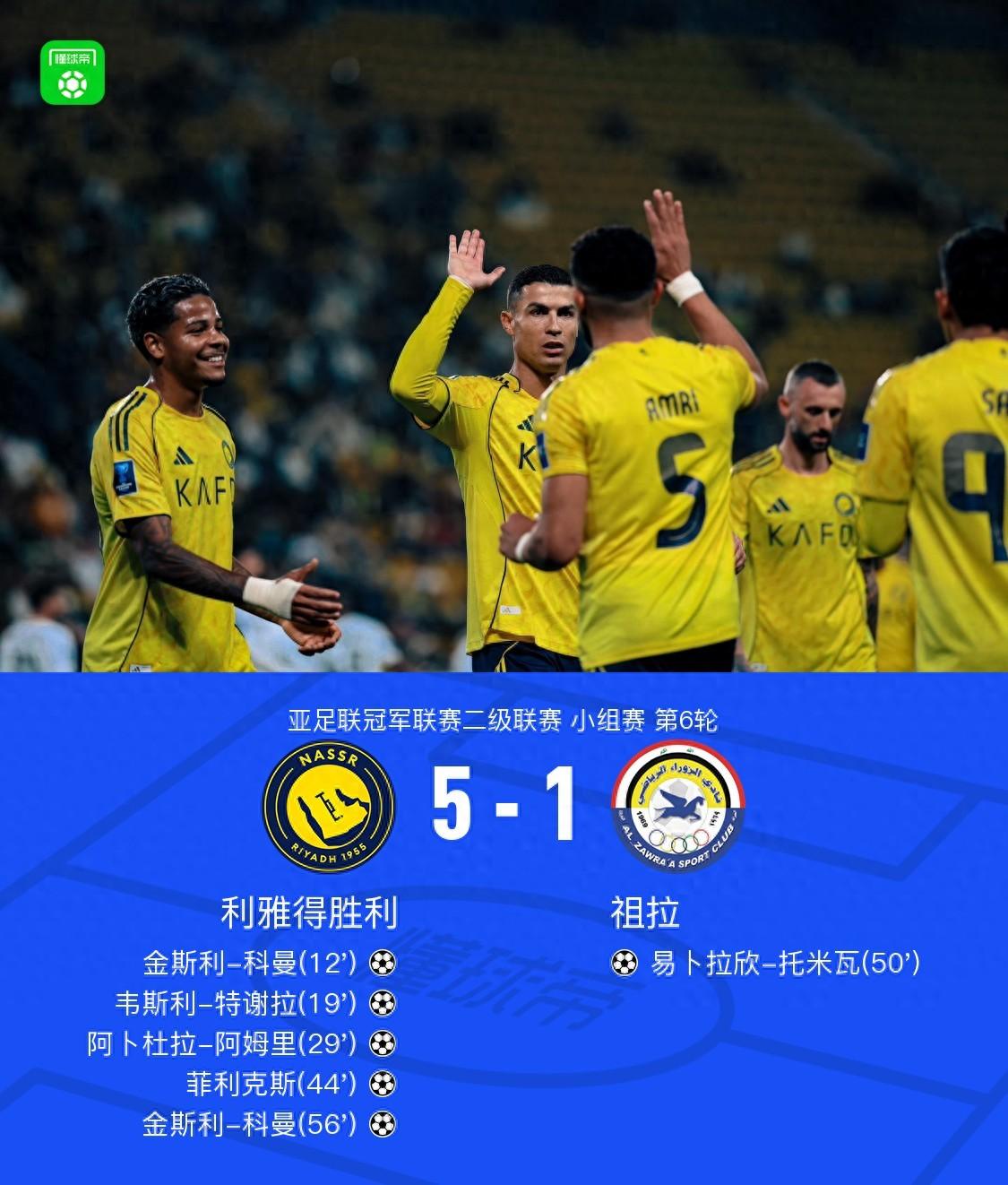 利雅得勝利5-1祖拉全勝戰績出線,C羅助攻,菲利克斯傳射建功