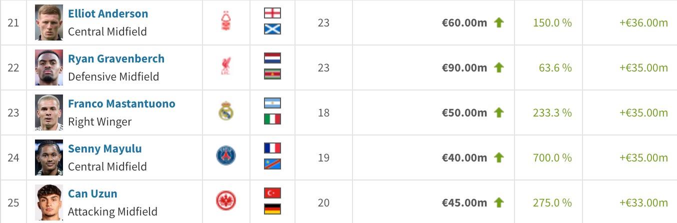 21. 埃利奧特-安德森(諾丁漢森林) +3600萬歐元(+150%) 6000萬歐元