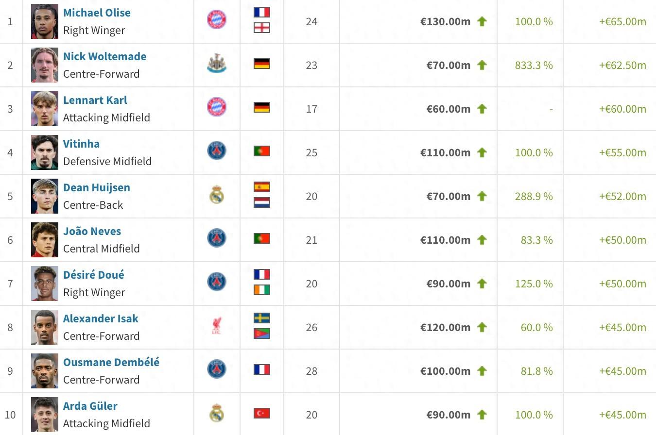 1. 奧利塞(拜仁慕尼黑) +6500萬歐元(+100%) 1.3億歐元