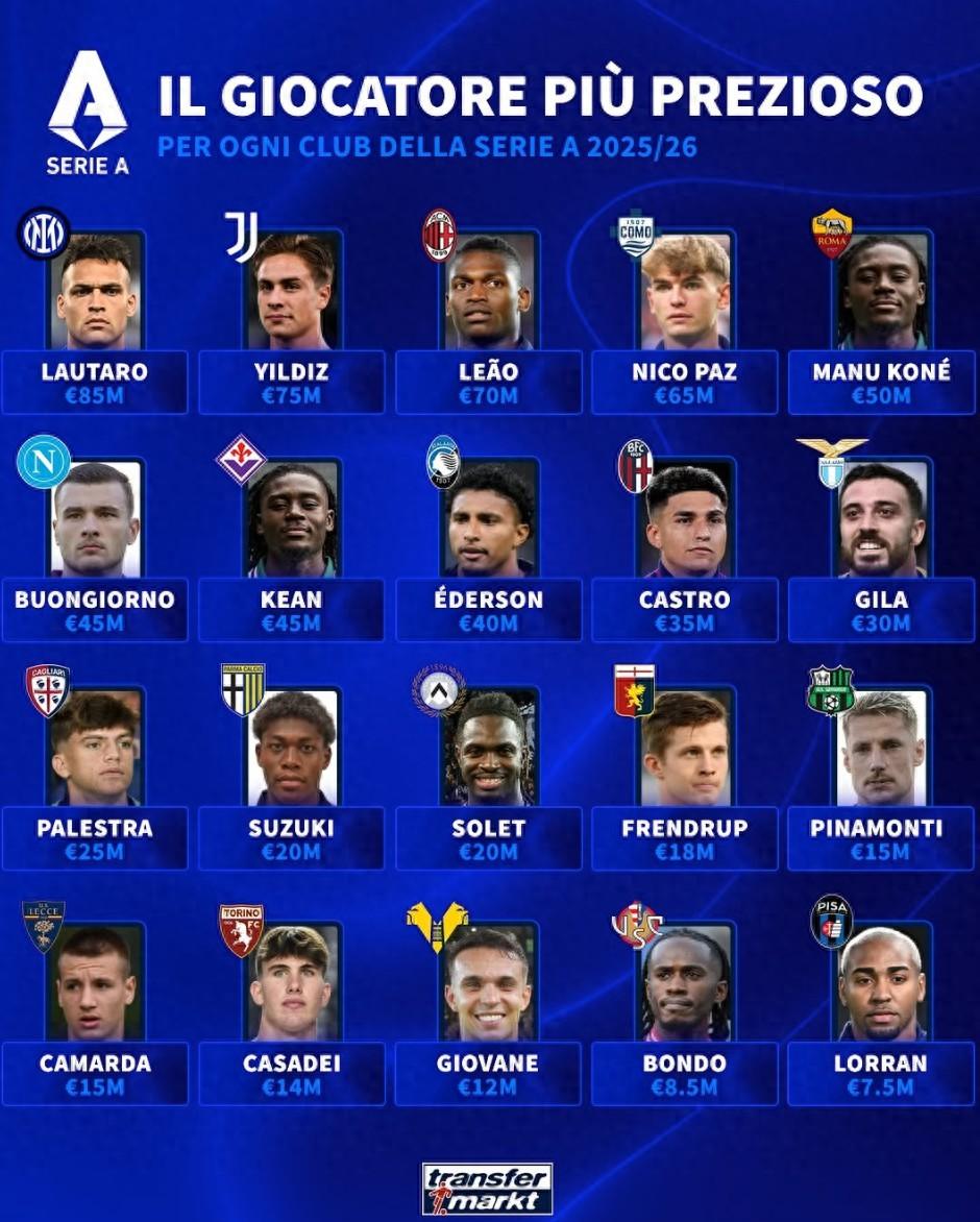 德轉更新後意甲20傢俱樂部身價最高球員:
