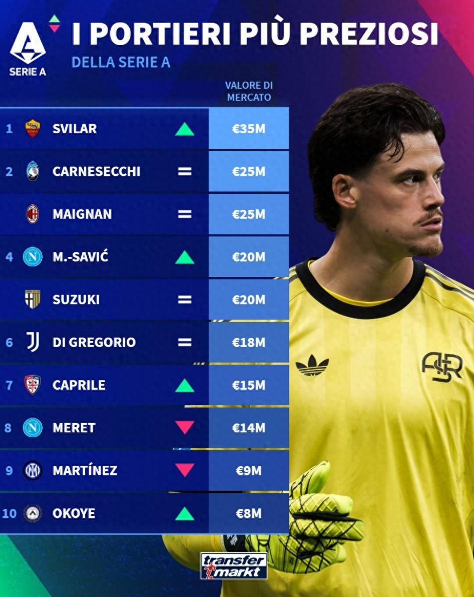北京時間12月25日,在更新了意甲球員的身價之後,德轉列出了此次更新後意甲門將身價前10,羅馬的斯維拉爾以3500萬歐元高居第一,卡爾內塞基和邁尼昂同以2500萬歐元並列第二。