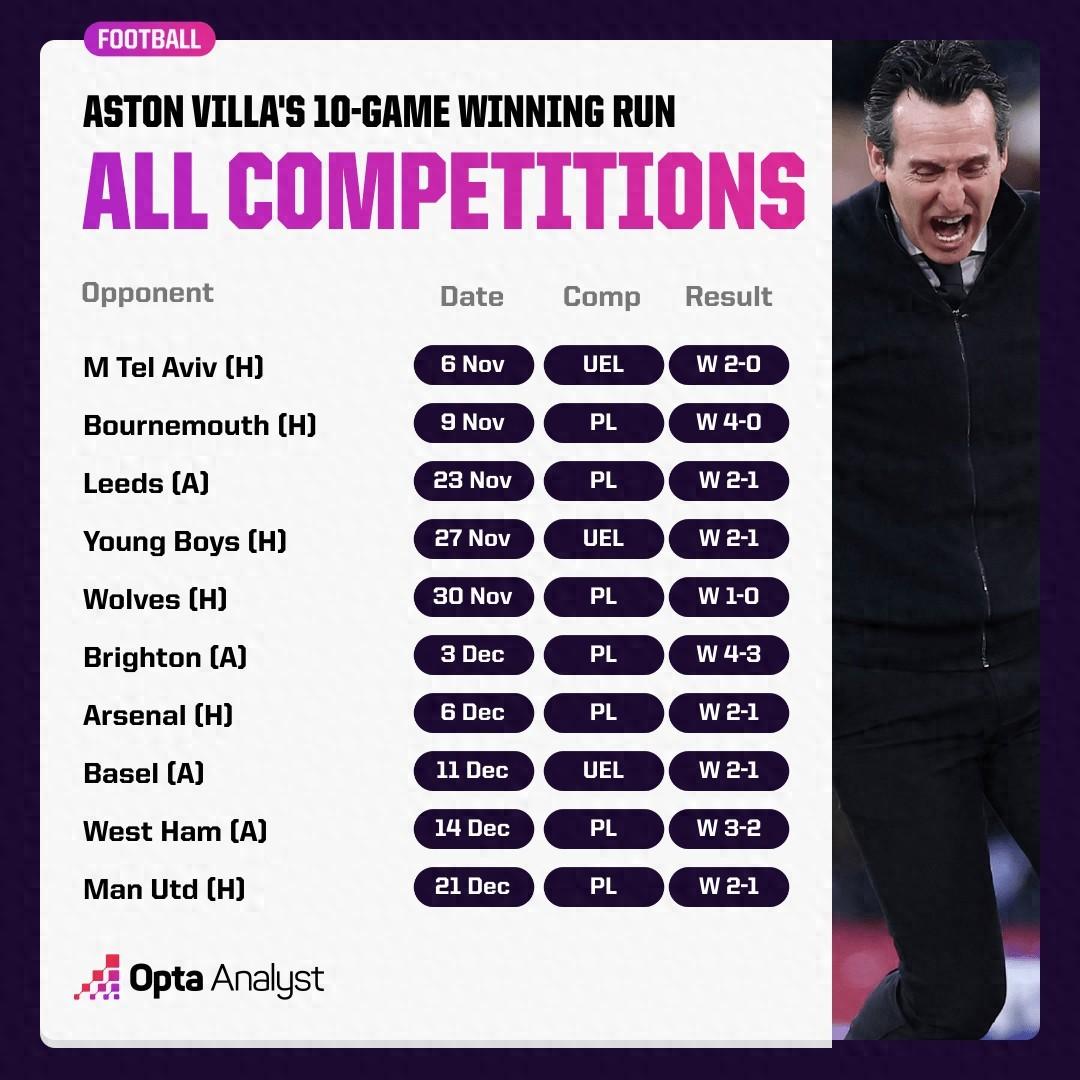 此外,維拉在英超中取得7連勝,他們上一次在頂級聯賽取得更長連勝要追溯到1910年10月至12月,當時豪取9連勝。