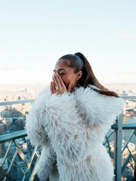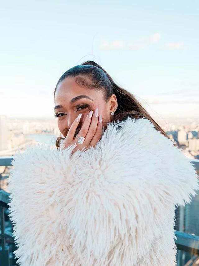 身着一身白衣的喬丹-伍茲和她的未婚夫唐斯站在紐約市“Overstory”雞尾酒吧的絕美風景中,看起來幸福滿滿。