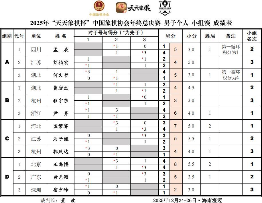 孟辰與何文哲的小分(兩次單循環小分之和)、勝局、直勝、犯規、後走勝局都一樣,因爲第一個循環的積分,何先贏,這樣微弱的不同,兩人雖然互相擊敗了對手。