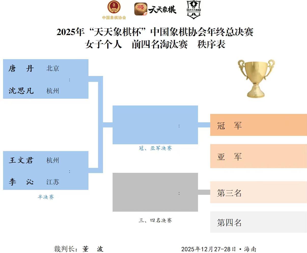 2025年“天天象棋杯”中國象棋協會年終總決賽的大戰,在海南澄邁,歷經激烈的小組拼殺,火線拼奪,驚心比拼,男女四強全速突圍,火力而進。