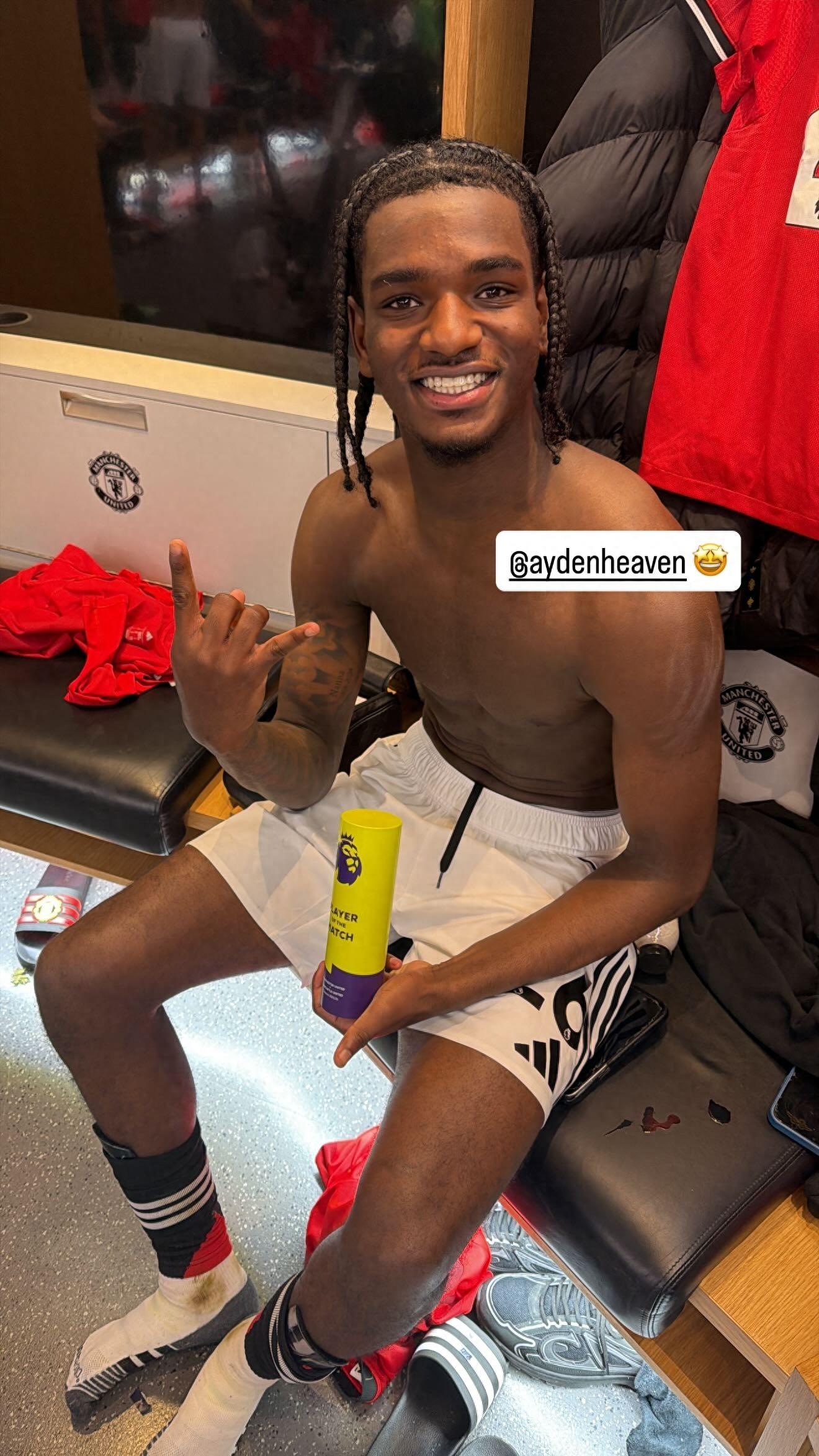 曼聯後衛約羅賽後在社交媒體曬出了海文在更衣室的照片,海文對着鏡頭比出手勢,另一隻手則拿着全場最佳球員獎盃。