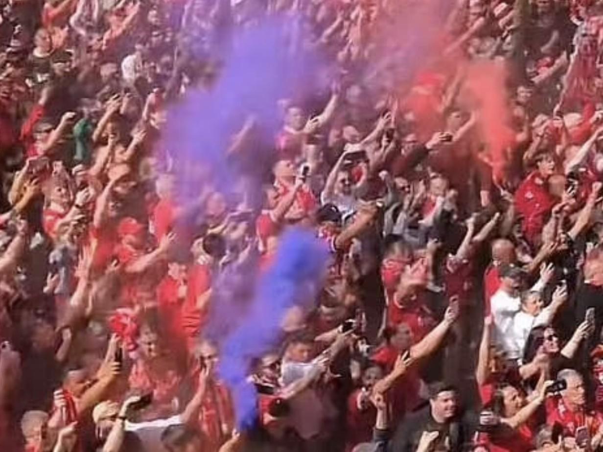 上賽季英超第34輪,利物浦5-1托特納姆熱刺提前奪得聯賽冠軍,一位埃弗頓球迷則在安菲爾德球場外出售了藍色煙霧彈,“戲弄”了一把利物浦球迷。