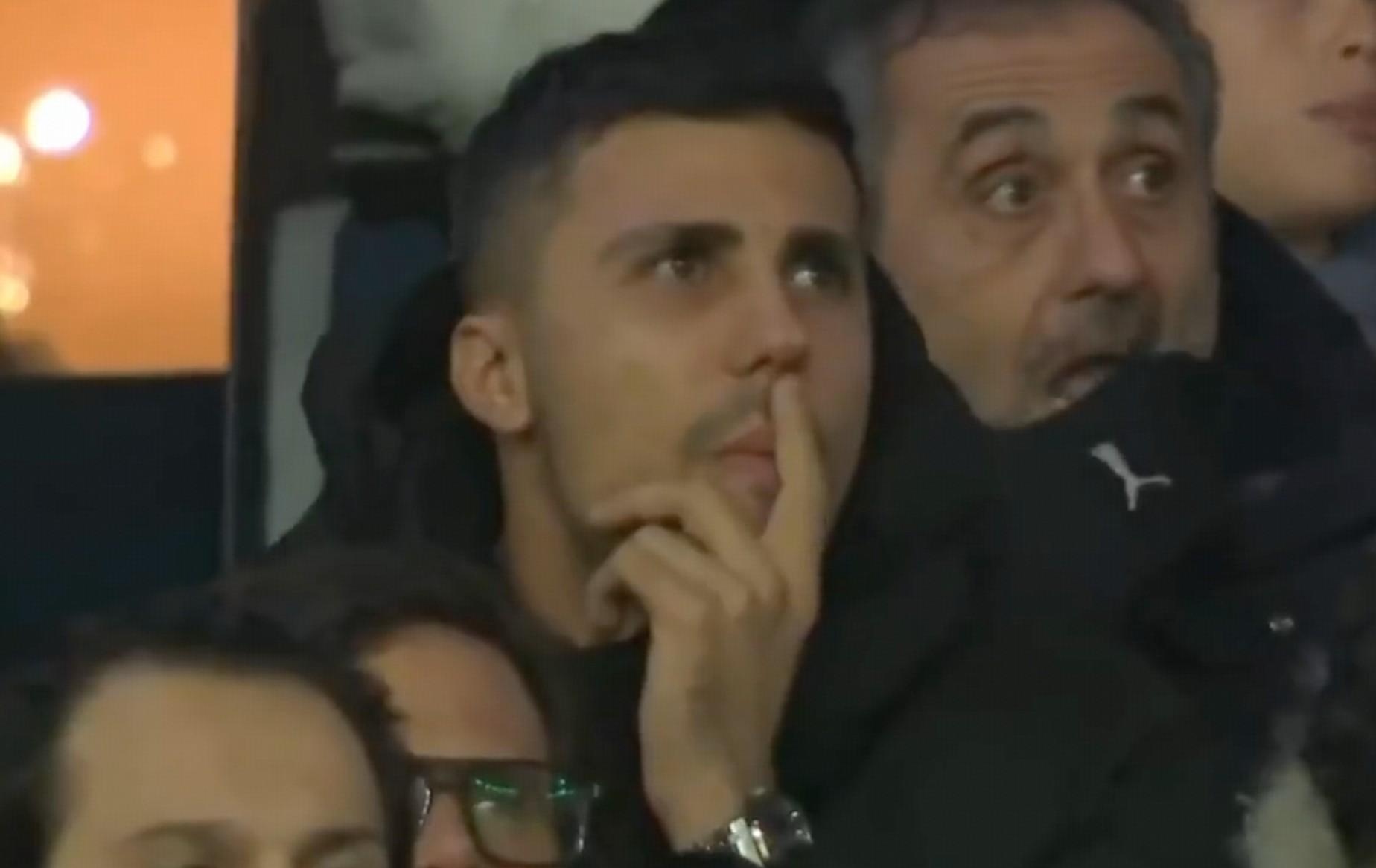 比賽第39分鐘,轉播鏡頭給到了在看臺上觀戰的羅德里,一名解說看到羅德里後說:“呦,這是?”隨後經過近十秒的沉寂後,另一名解說回應道:“一時想不起來了”。