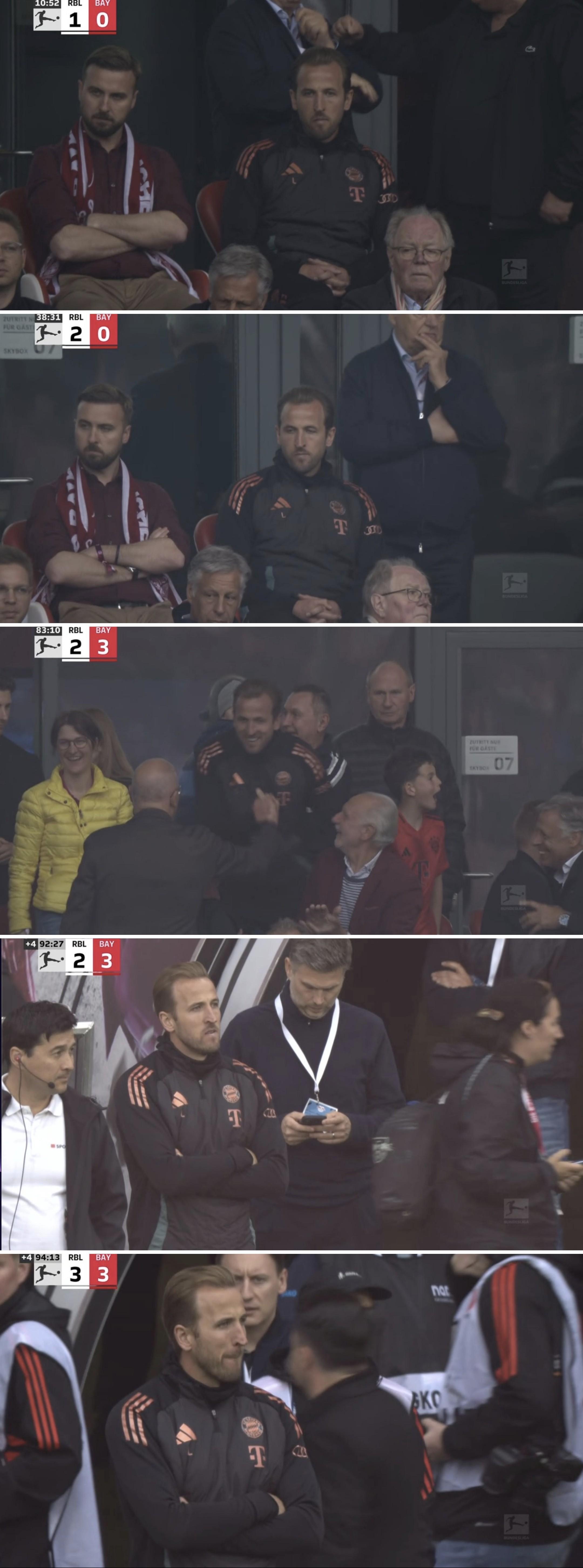 當比賽進入傷停補時階段的時候,凱恩明顯已經迫不及待,直接走到了場邊等待着主裁判吹響終場哨。然而萊比錫在最後時刻攻入了讀秒絕平的進球,於是轉播鏡頭再次找到凱恩,此時的凱恩表情顯得極爲複雜。