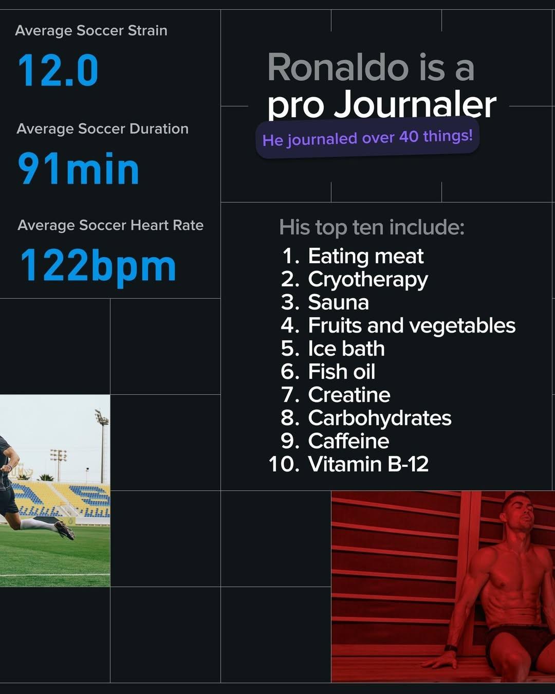 2025年,C羅記錄了超過40件事,其中排在前10名的分別是:攝入肉類、冷凍療法、桑拿、攝入水果和蔬菜、冰浴、攝入魚油、肌酸、碳水化合物、攝入咖啡因、維生素B12。