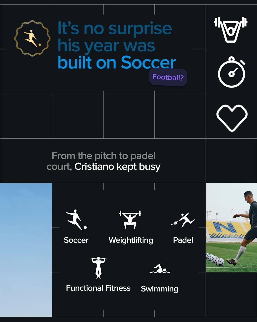 這一年,C羅記錄了501次運動,進行了足球、舉重、板式網球、功能性健身、游泳等不同種類的運動。