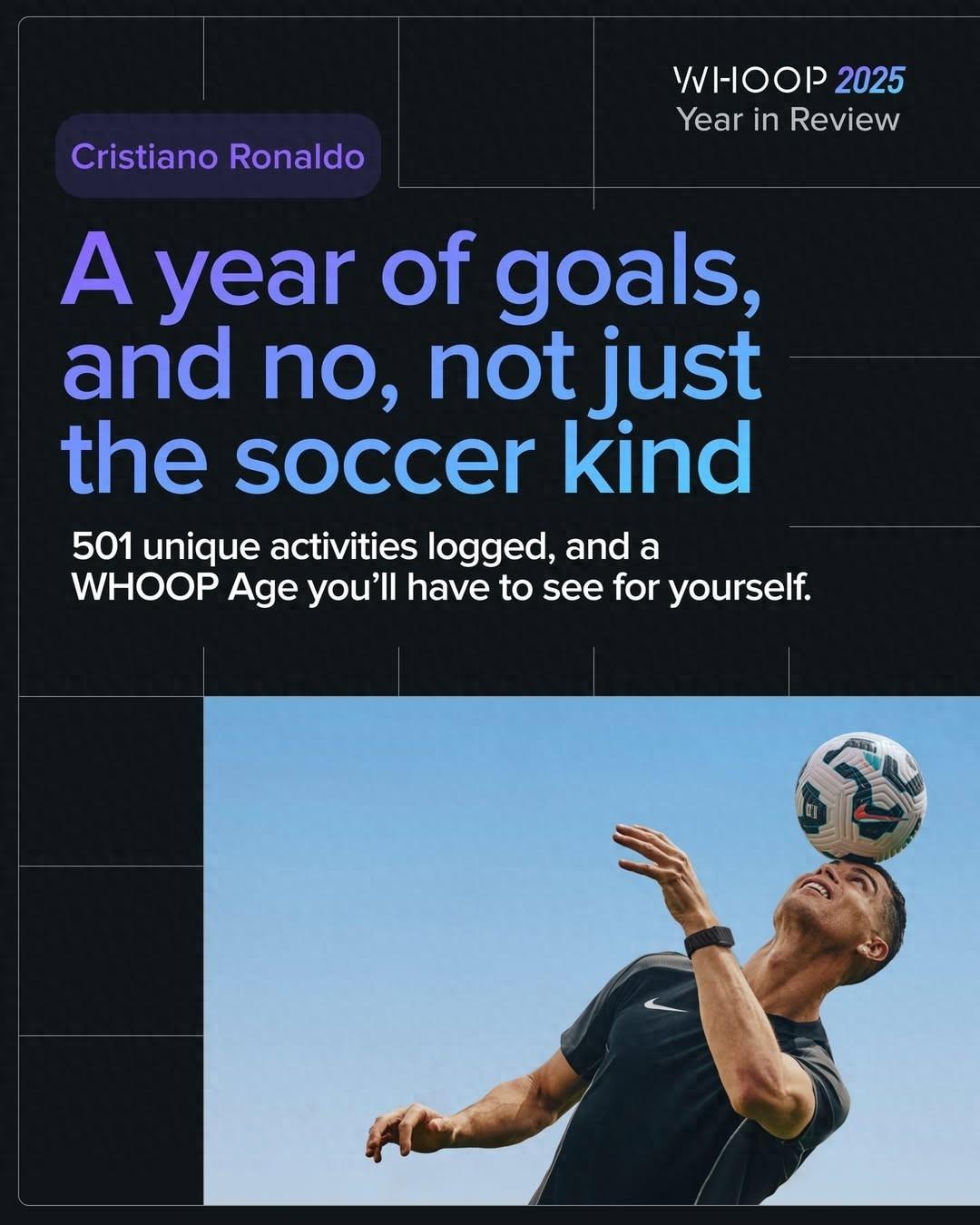 健康監測設備Whoop公佈C羅的2025年度健康報告,並指出C羅的身體年齡爲28歲,比實際年齡年輕12歲。