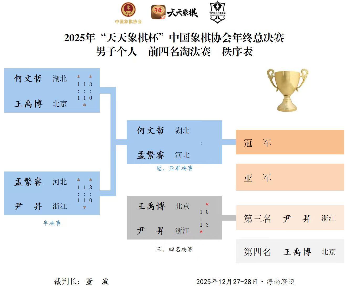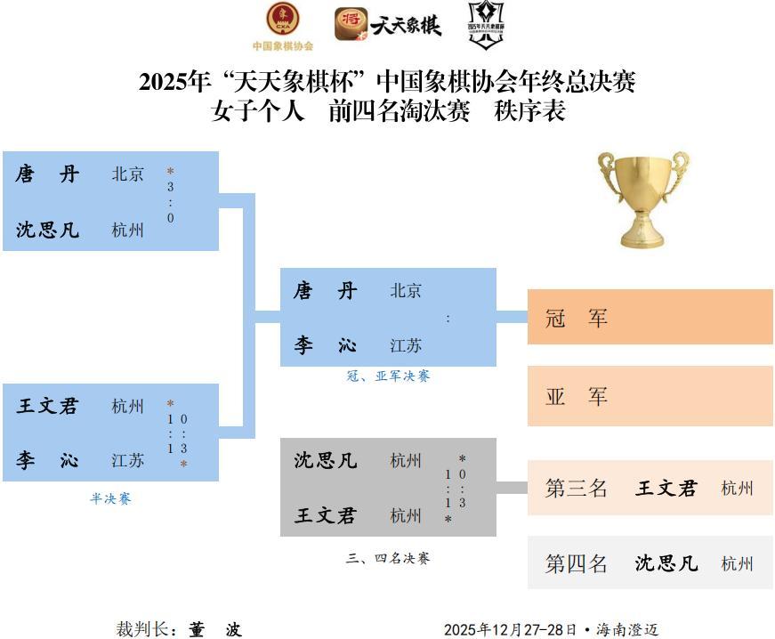 2025年天天象棋杯年終總決賽的超級大斗,在海南澄邁,演繹猛烈的火力廝殺,男女組決賽戰單和冠亞軍以下各數排位,一皆而出。