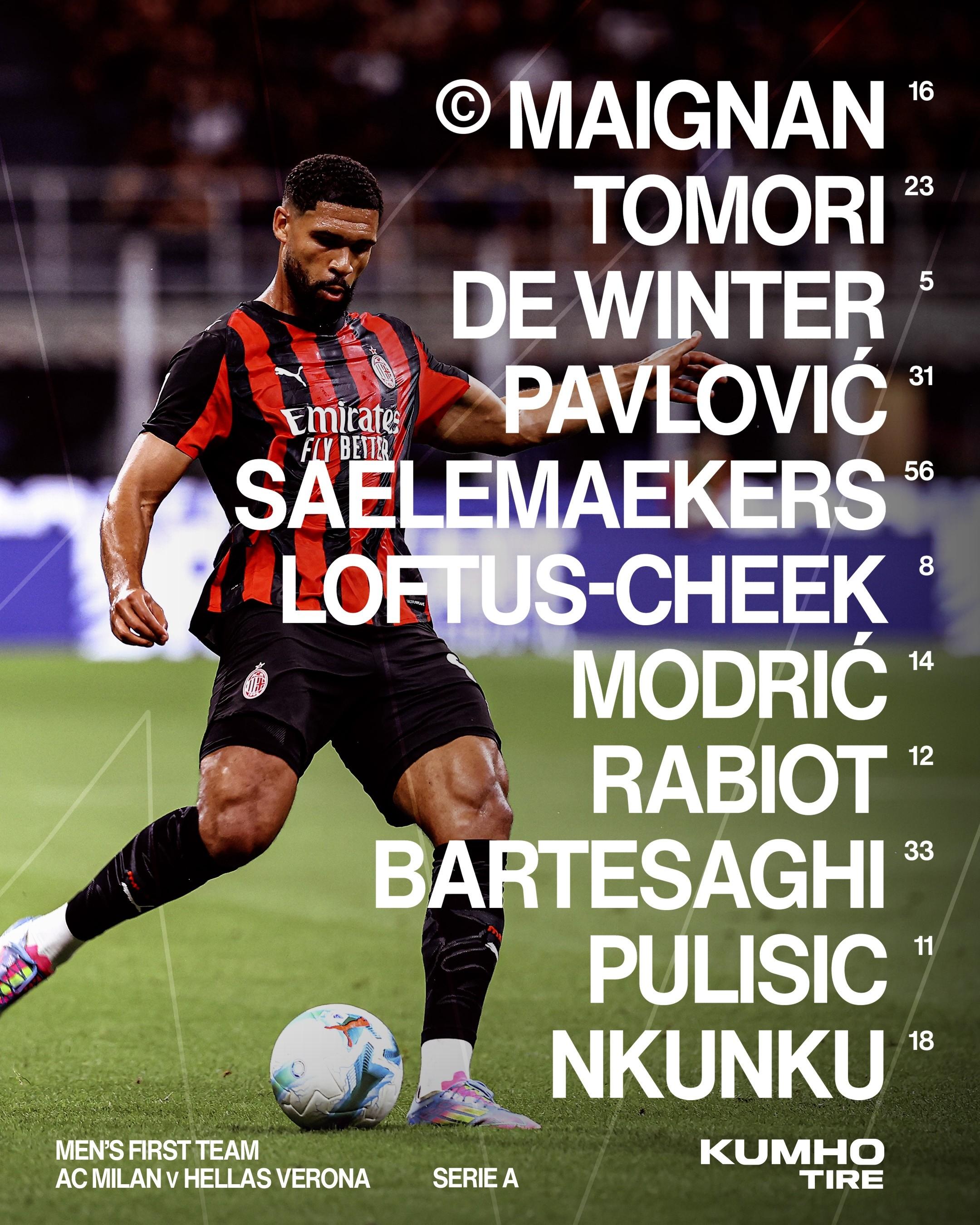 米蘭首發:16-邁尼昂、23-託莫里、5-德溫特、31-帕夫洛維奇、56-薩勒馬克爾斯、8-洛夫圖斯-奇克、14-莫德里奇、12-拉比奧、33-巴爾泰薩吉、18-恩昆庫、11-普利希奇