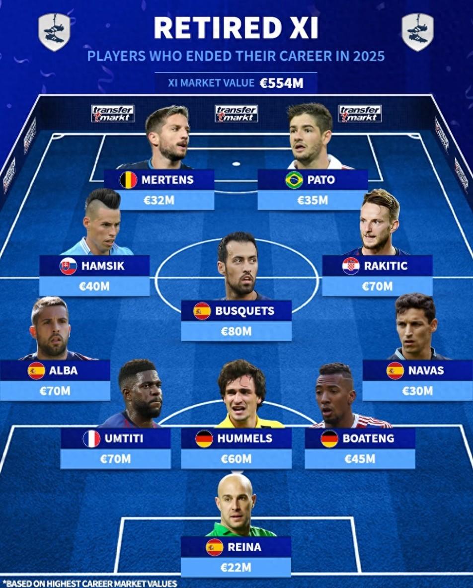 德轉列2025年退役球員最佳11人(括號內爲生涯德轉最高身價):