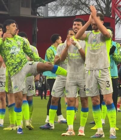 在週六晚進行的英超第18輪比賽中,曼城客場2-1擊敗諾丁漢森林,比賽結束後,曼城的球員們來到客隊看臺前向遠征的球迷致謝。