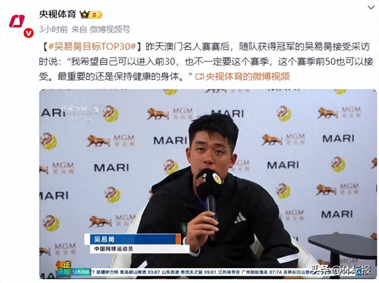 上週末,美高梅澳門網球名人賽舉行。隨隊獲得冠軍的吳易昺在賽後接受採訪時說:“我希望自己可以進入前30,也不一定要這個賽季,這個賽季前50也可以接受。最重要的還是保持健康的身體。”這位剛在全運會奪金的ATP選手,已經開始期待1月5日開始的ATP香港站。