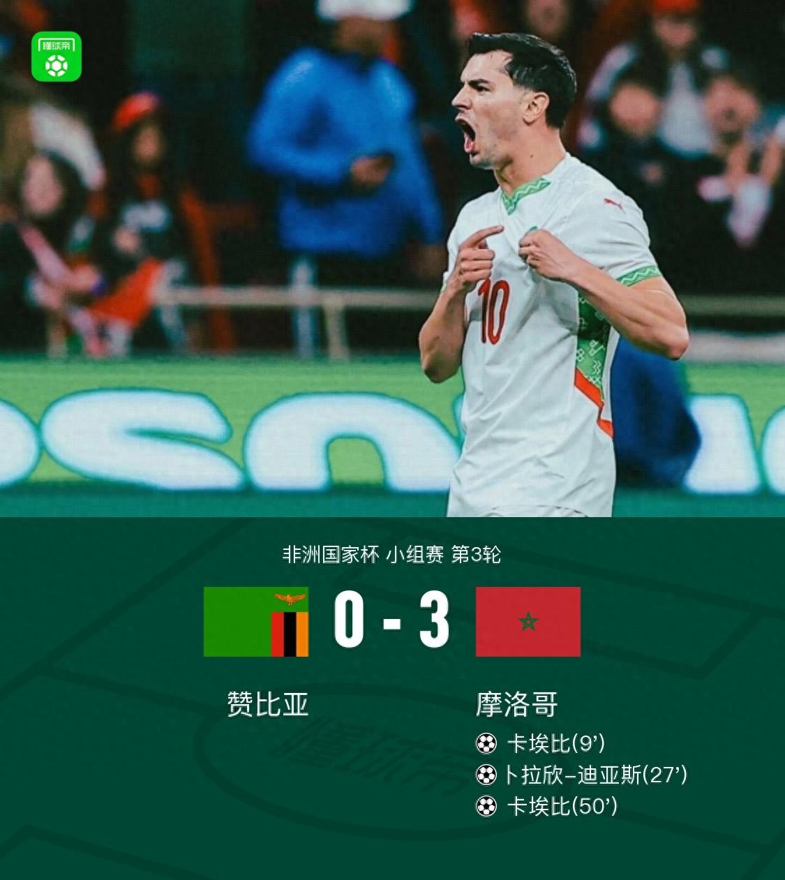 摩洛哥3-0贊比亞小組頭名晉級,卡埃比梅開二度+倒鉤破門,迪亞斯建功