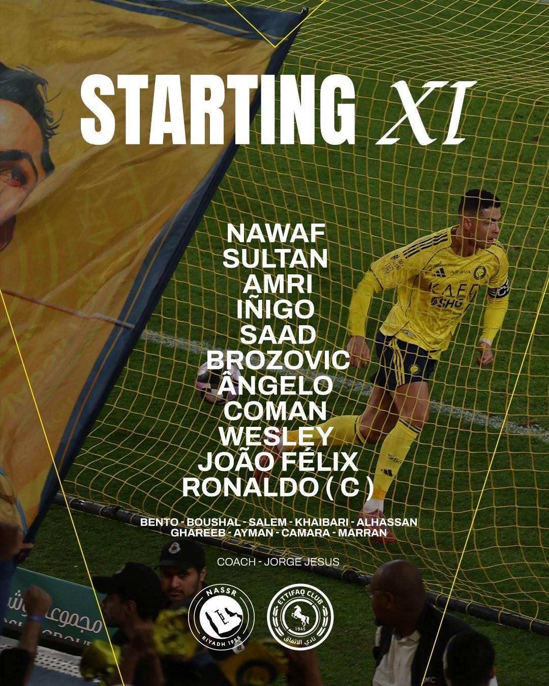 北京時間12月31日1:30,沙特聯第12輪,利雅得勝利客場對陣達曼協作。賽前首發公佈。